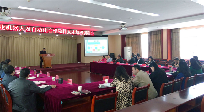 4月7号上午在学会与之合作办学的另一所学校,湖北交通职业技术学院召开座谈会。学校党委书记戴光驰、校长陈方晔以及相关职能处室、机电学院负责人参加座谈会,陈万诚主持。戴光驰书记致欢迎词;陈方晔校长介绍学校情况;机电学院院长上官兵和学会副秘书长兼培训部主任韩永广分别代表学校和学会介绍合作办学。这是一个校会企三方合作的办学模式。2015年4月交通职业院、湖北学会和武汉奋进智能机器有限公司三方签订合作兴办“机电一体化(工业机器人及自动化技术)”专业。奋进智公司是湖北省内具有相当规模的工业机器人制造高新技术企业、也是湖北省工业机器人产业联盟理事长单位,校会企三方合作有利于办出专业特色,有利于实施《中国制造2025》,培养高端装备制造技能型人才。同年9月招收录取新生192人。学会先期投入70万元初步建立了专业授课教室和机器人实训室,购买了相应教学设施和两台ABB工业机器人。随着专业教学的逐步开展,第二期学会还将投入240万元。