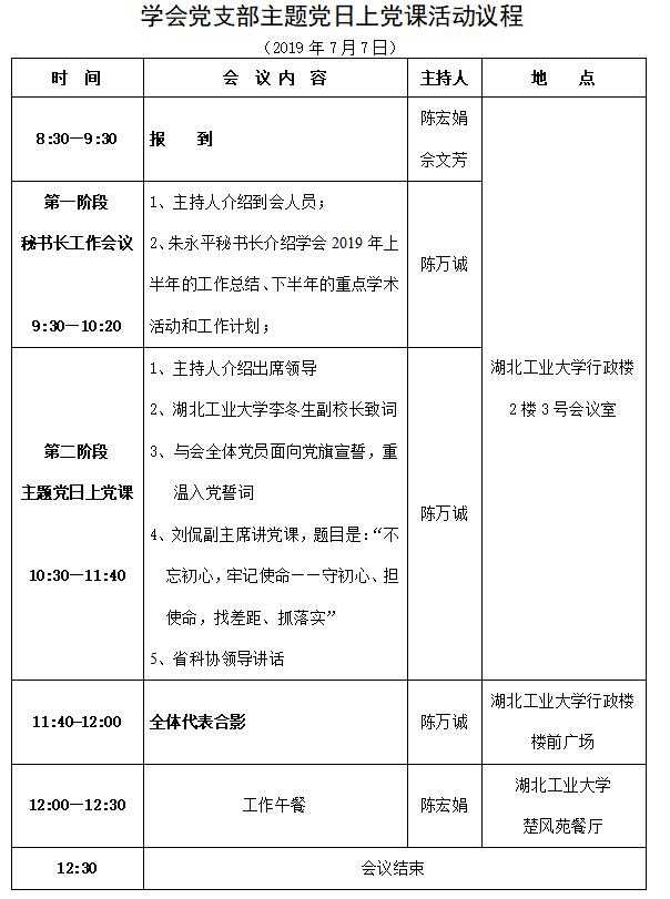 为了纪念中国共产党成立98周年华诞,深入学习习近平总书记关于守初心、担使命,找差距、抓落实,切实搞好“不忘初心,牢记使命”主题教育活动的讲话精神,学会党支部定于2019年7月7日(星期日)在湖北工业大学举办主题党日讲党课活动,邀请省科协新任党组成员,刘侃副主席讲党课,题目是:“不忘初心,牢记使命——守初心、担使命,找差距、抓落实”。