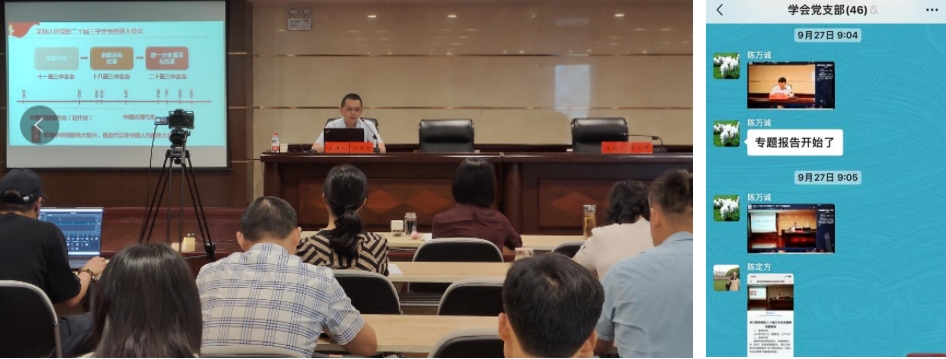 2024年9月27日,武汉市科协召开学习贯彻党的二十届三中全会精神专题报告会,学会党支部党员、专家准时参加视频会议,认真收看报告会。市委宣讲团成员、中国地质大学沈传波教授以《进一步全面深化改革 谱写中国式现代化时代新篇——学习贯彻落实党的二十届三中全会精神》为题作宣讲报告。沈传波教授紧紧围绕习近平总书记在党的二十届三中全会上的重要讲话精神和全会《决定》,从深刻认识党的十二届三中全会的重大意义,深刻领会和把握进一步全面深化改革的重大举措等多个具体方面,结合习总书记对科技创新的要求对科技教育人才体制机制一体改革作了深入讲解。宣讲报告主题鲜明、内容丰富、分析透彻,观点新、站位高、思考深,对党员干部感悟思想伟力、汲取奋进力量具有重要指导意义。