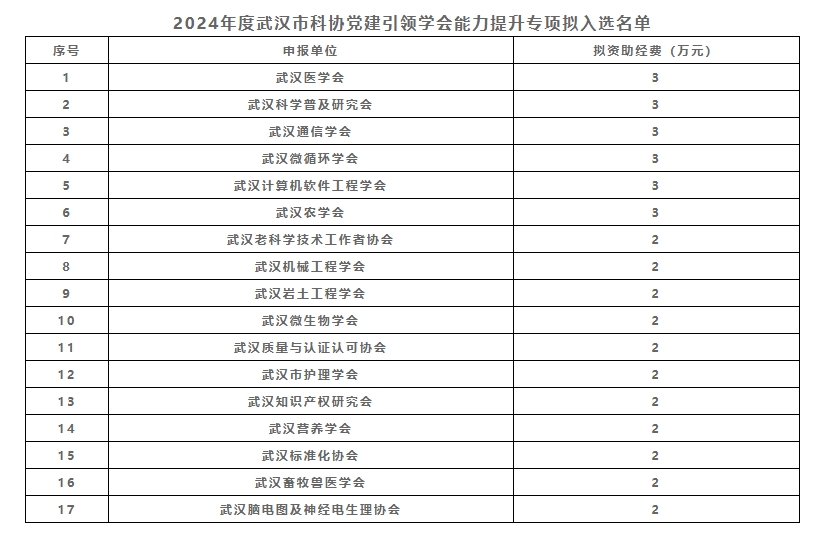 2024年6月,根据武汉市科协《关于组织实施2024年度武汉市科协党建引领学会能力提升专项的通知》要求,经学会申报、形式审查、第三方组织专家评审等,武汉机械工程学会等17家学会入选2024年度武汉市科协党建引领学会能力提升专项名单。