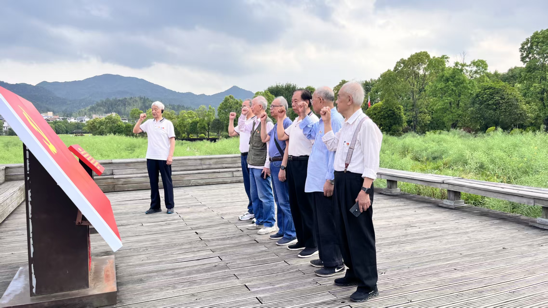 七位老学会工作者、老党员在古田会议会旧址前重温入党誓词,再一次向党宣誓。