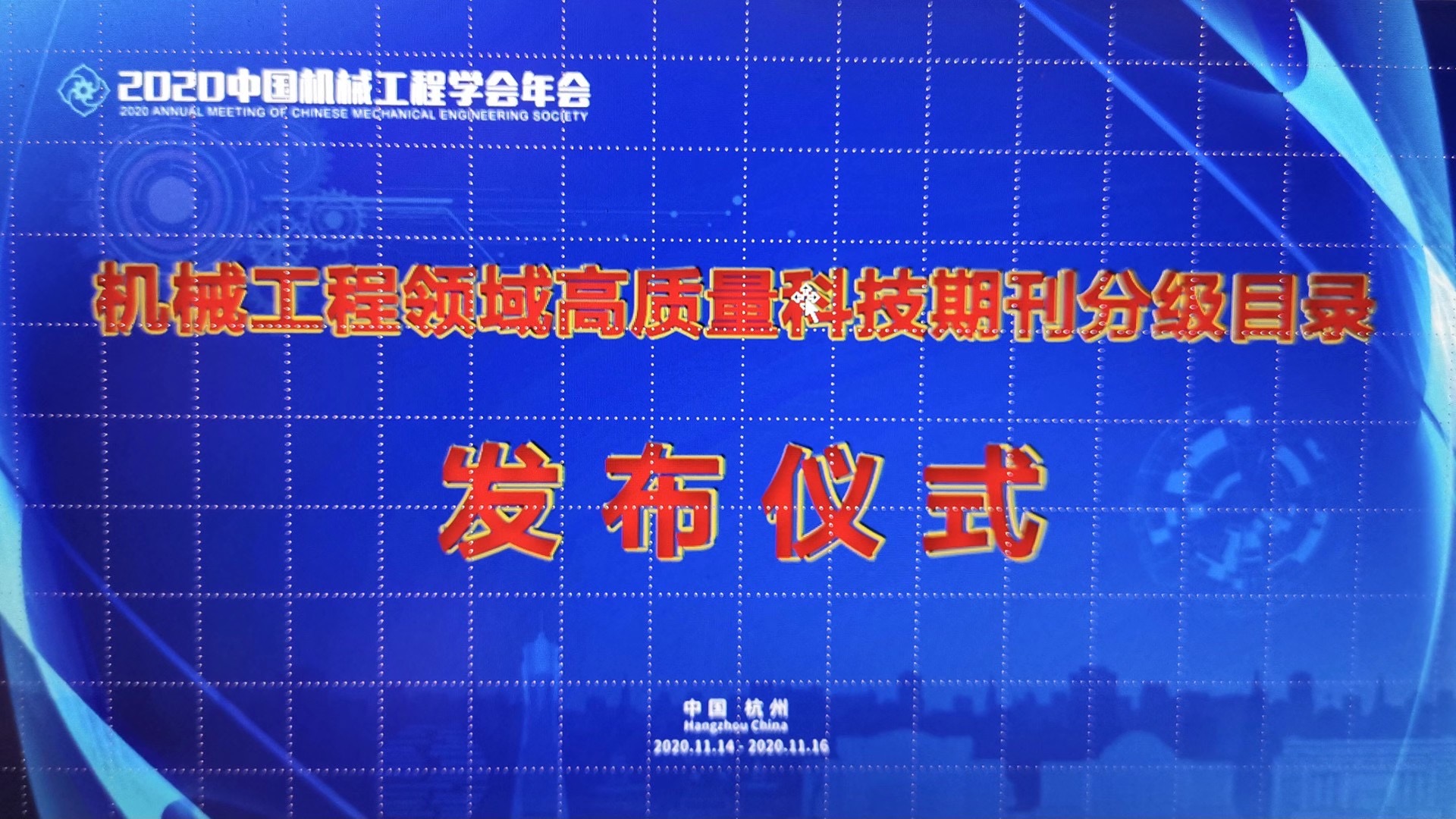 2020年11月15日,2020年中国机械工程学会年会主旨报告会在杭州举行。