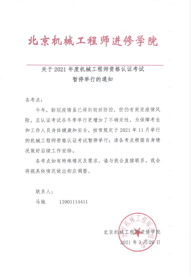 关于2021年度机械工程师资格认证考试暂停举行的通知