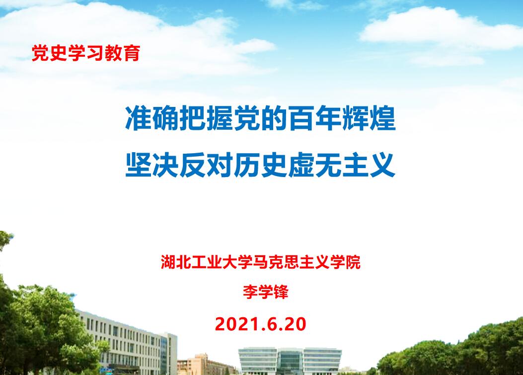 - 湖北工业大学马克思主义学院党委书记李学锋教授讲党课,题目是“准确把握党的百年辉煌 坚决反对历史虚无主义”.