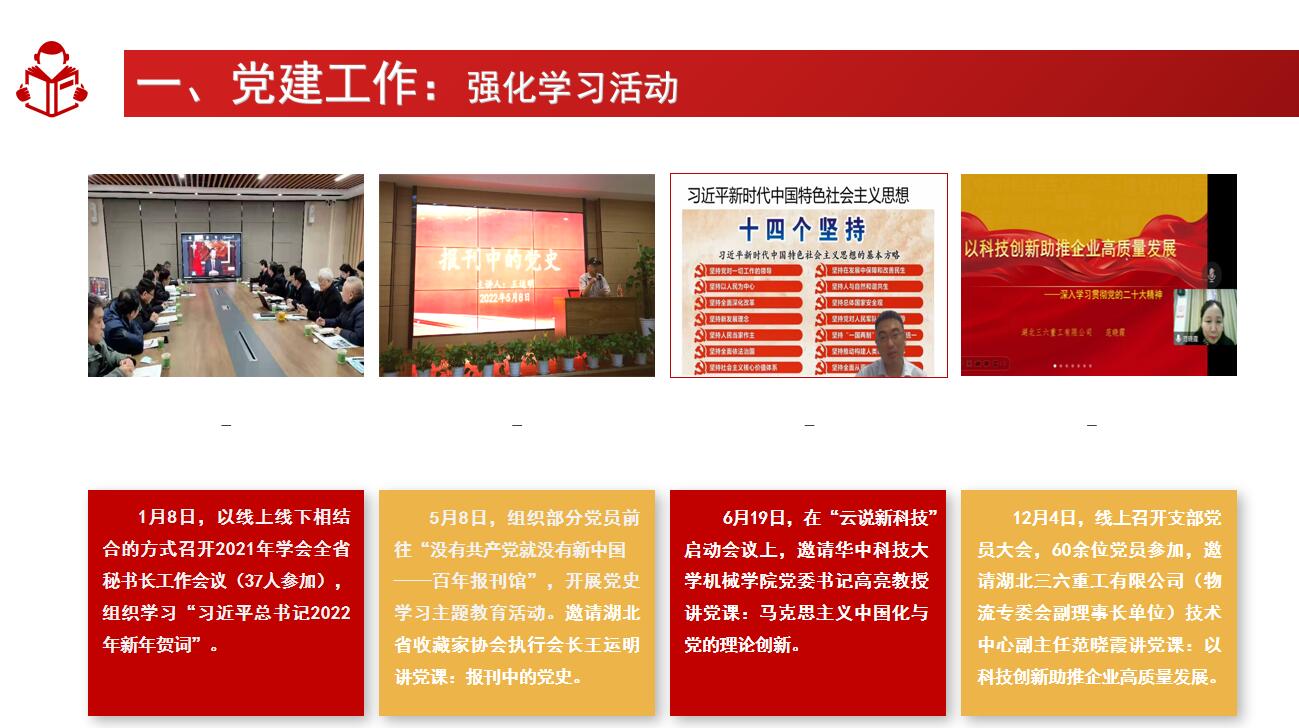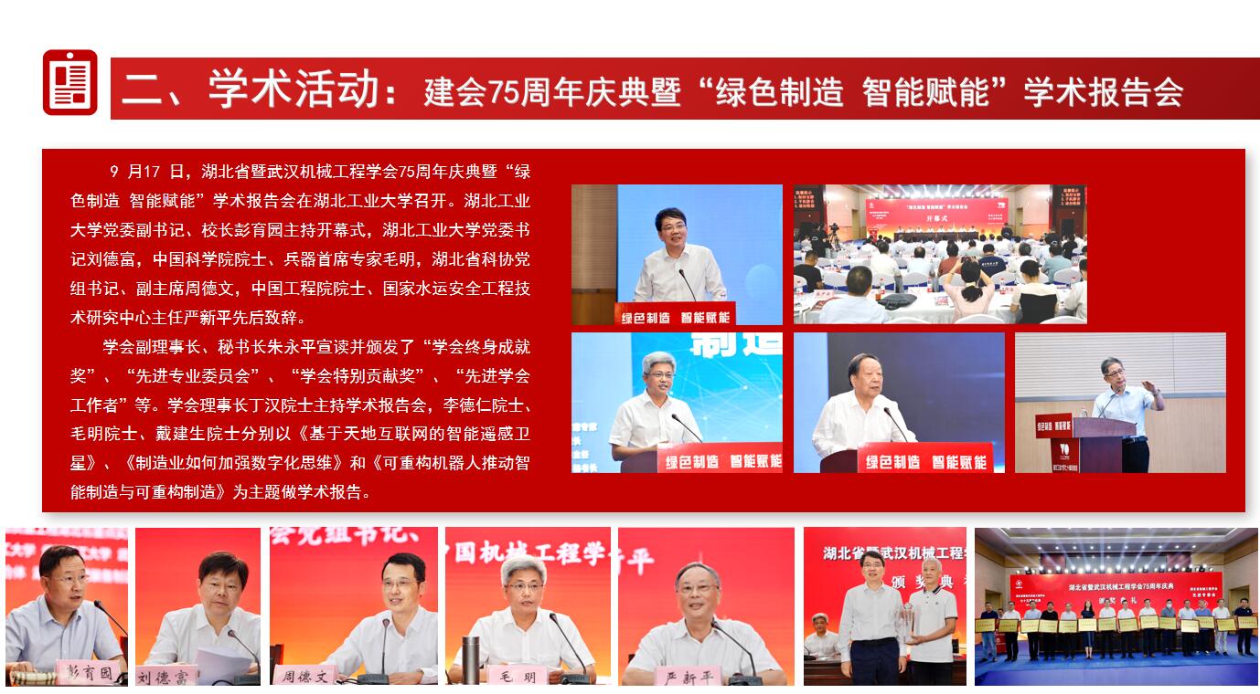 2023年将举办2023年学会理事扩大会议暨学术报告会等一系列高端学术交流活动,如:中国科协智能制造学会联合体发展高峰论坛、第十届武汉科学年会、机博会主题论坛、智能制造国际论坛,还有丰富精彩的专委会活动。如:船舶机械装备技术发展及应用高级论坛、船舶机械设计专题讲座、先进润滑技术中德研讨会、中部地区摩擦学论坛、2023年摩擦学专业委员会学术年会、湖北省第十届材料热处理委员会理事会及2023年学术交流年会、机械设计与传动专委会暨武汉机械设计与传动学会第31届学术年会、2023 年第十六届泛珠三角(扩大)塑性工程(锻压)学术年会、2023 第五届湖北模具产业发展高峰论坛、湖北省模具工业协会&塑性工程学会 2023 年会、第四届中国泛西部无损检测学术会议、粉末冶金与能源装备技术应用、粉末冶金与材料轻量化技术应用、2023年武汉“好设计”工业设计(暨制造业创新设计)大赛、中西部地区理化检验联合会第九届学术年会、理化检验专业委员会学术交流会、机械工业自动化专委会学术年会、激光焊接技术研讨大会、湖北地区机械与物流工程研究生学术论坛、物流工程专业委员会学术年会、2023湖北省铸造学术会议等。