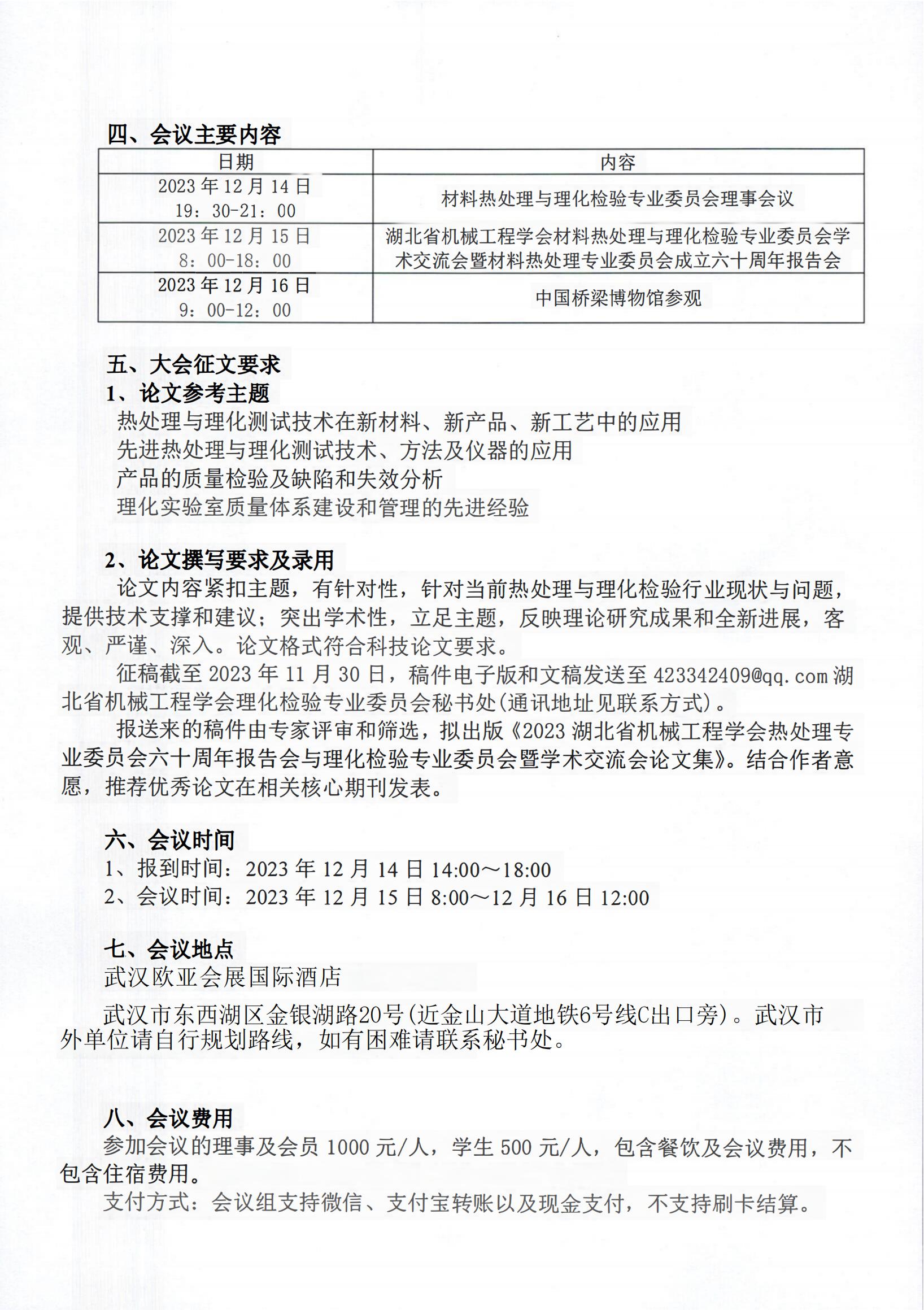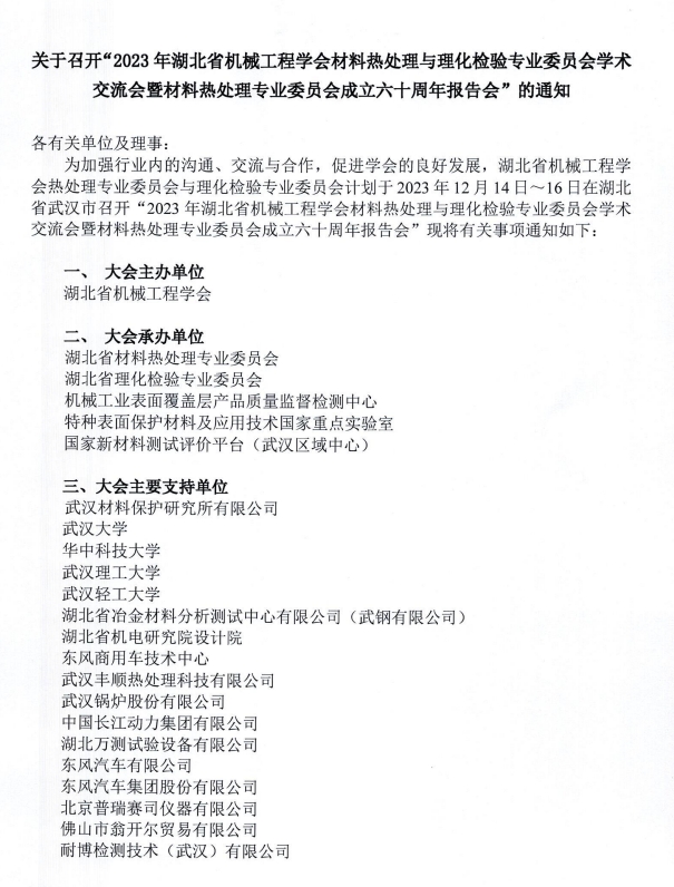 2023年湖北省机械工程学会材料热处理与理化检验专业委员会学术交流会暨材料热处理专业委员会成立六十周年报告会定于2023年12月14-16日在武汉欧亚会展国际酒店召开。