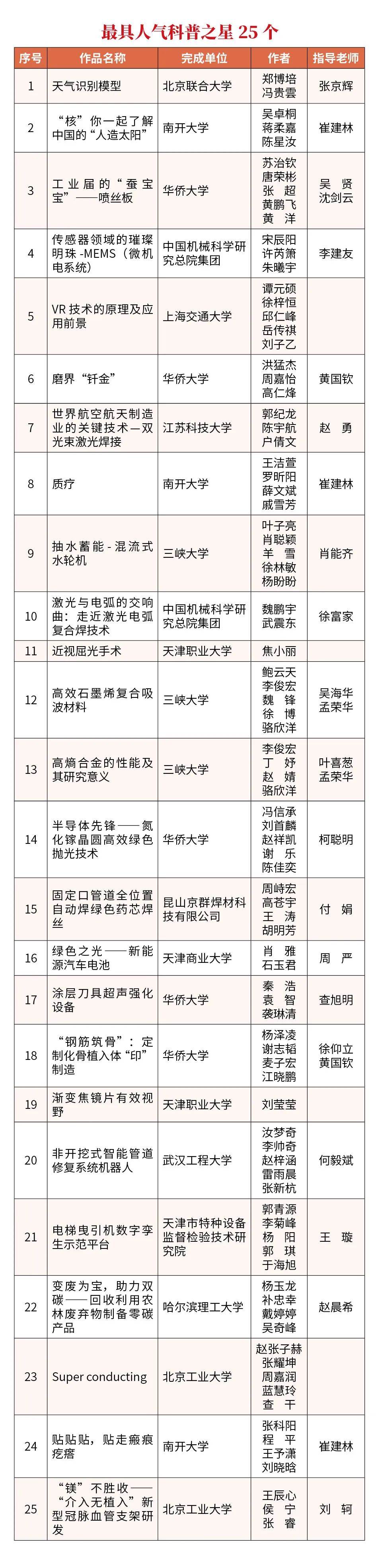 2023年“云说新科技”科普新星秀评选工作已结束,共有84个科普作品获得“2023年度科普新星”,其中“2023年度科普新星(金星)”13个,“2023年度科普新星(银星)”21个,“2023年度科普新星(铜星)”50个;同时,25个作品获得“2023年度最具人气科普之星”。