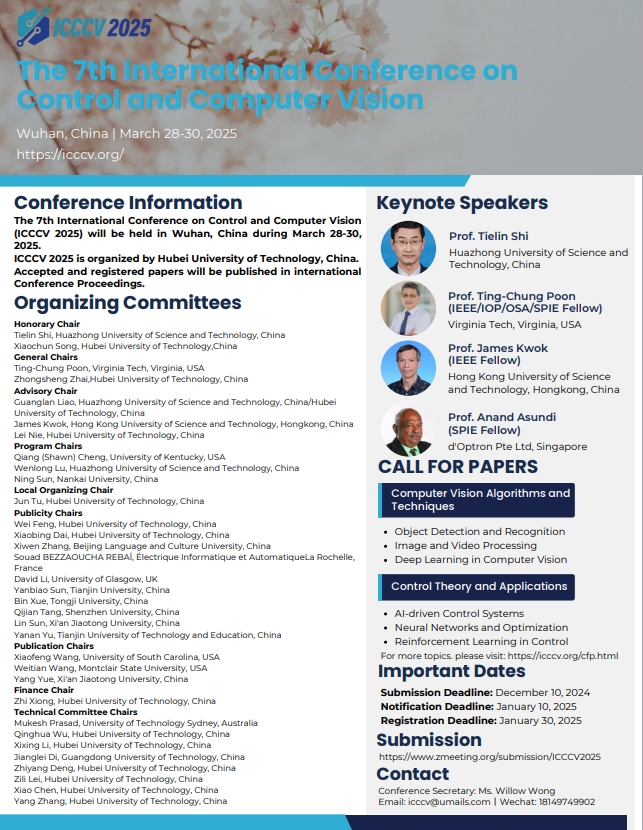 2025年第七届控制与计算机视觉国际会议将于2025年3月28日至30日在湖北工业大学召开。
