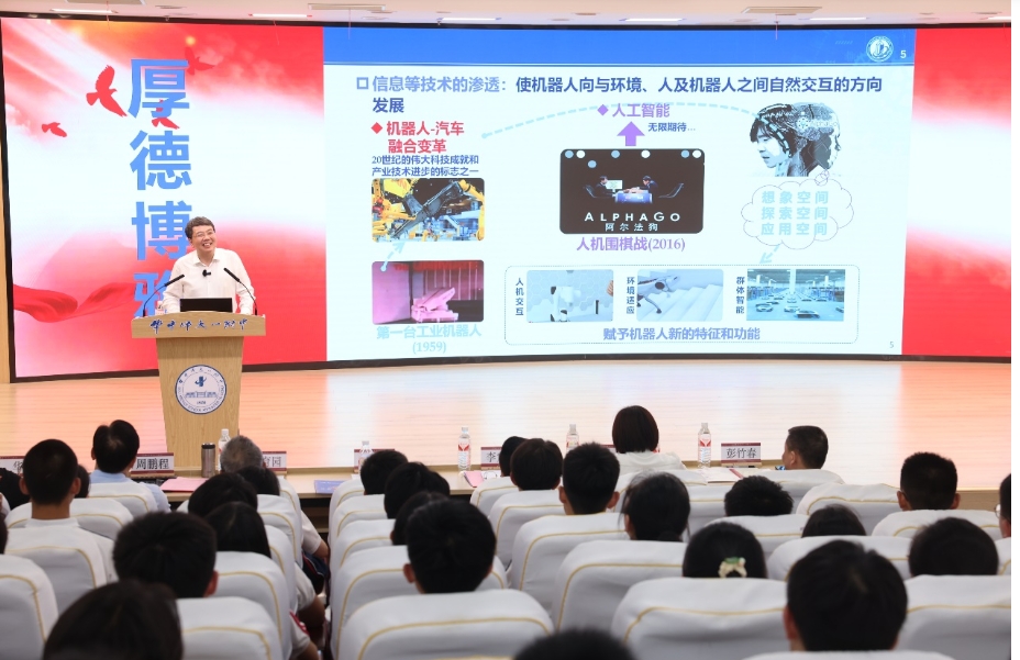 丁汉院士以《机器人的未来技术》为题为300余名学生开讲。丁院士是我国著名的机器人与智能制造专家,任华中科技大学学术委员会主任、未来技术学院院长,国家数字化设计与制造创新中心主任,智能制造装备与技术全国重点实验室主任,国家自然科学基金重大研究计划“共融机器人的基础理论与关键技术研究”指导专家组组长和基础科学中心“机器人化智能制造”首席科学家。