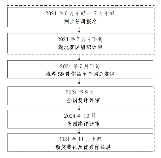2024年5月至7月,大赛(湖北赛区)组委会负责主赛道作品的组织、宣传、评审和推荐工作。省内各高校组织本校学生参赛,湖北赛区组委会组织专家对所有的参赛作品进行分类评审,产生本赛区的获奖作品,最终遴选59件优秀作品推荐至全国大赛组委会,参加2024年(第七届)全国大学生工业设计大赛复评。复评(全国赛区评审)及终评(全国赛区评审)分别在2024年9月和10月举行,详见全国大赛官网。