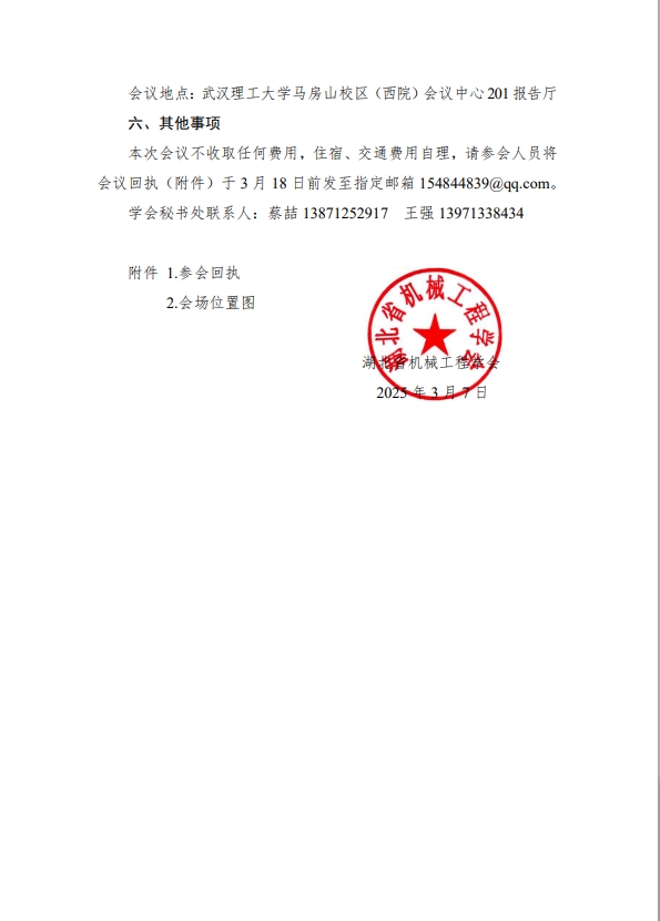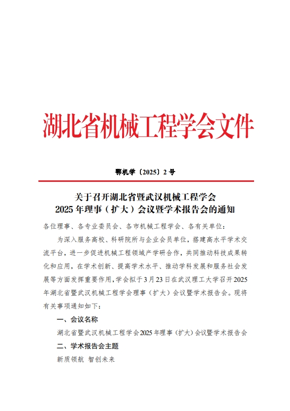 为深入服务高校、科研院所与企业会员单位,搭建高水平学术交流平台,进一步促进机械工程领域产学研合作,共同推动科技成果转化和应用,在学术创新、提高学术水平、推动学科发展和服务社会发展等方面发挥重要作用,学会拟于3月23日在武汉理工大学召开2025年湖北省暨武汉机械工程学会理事(扩大)会议暨学术报告会。