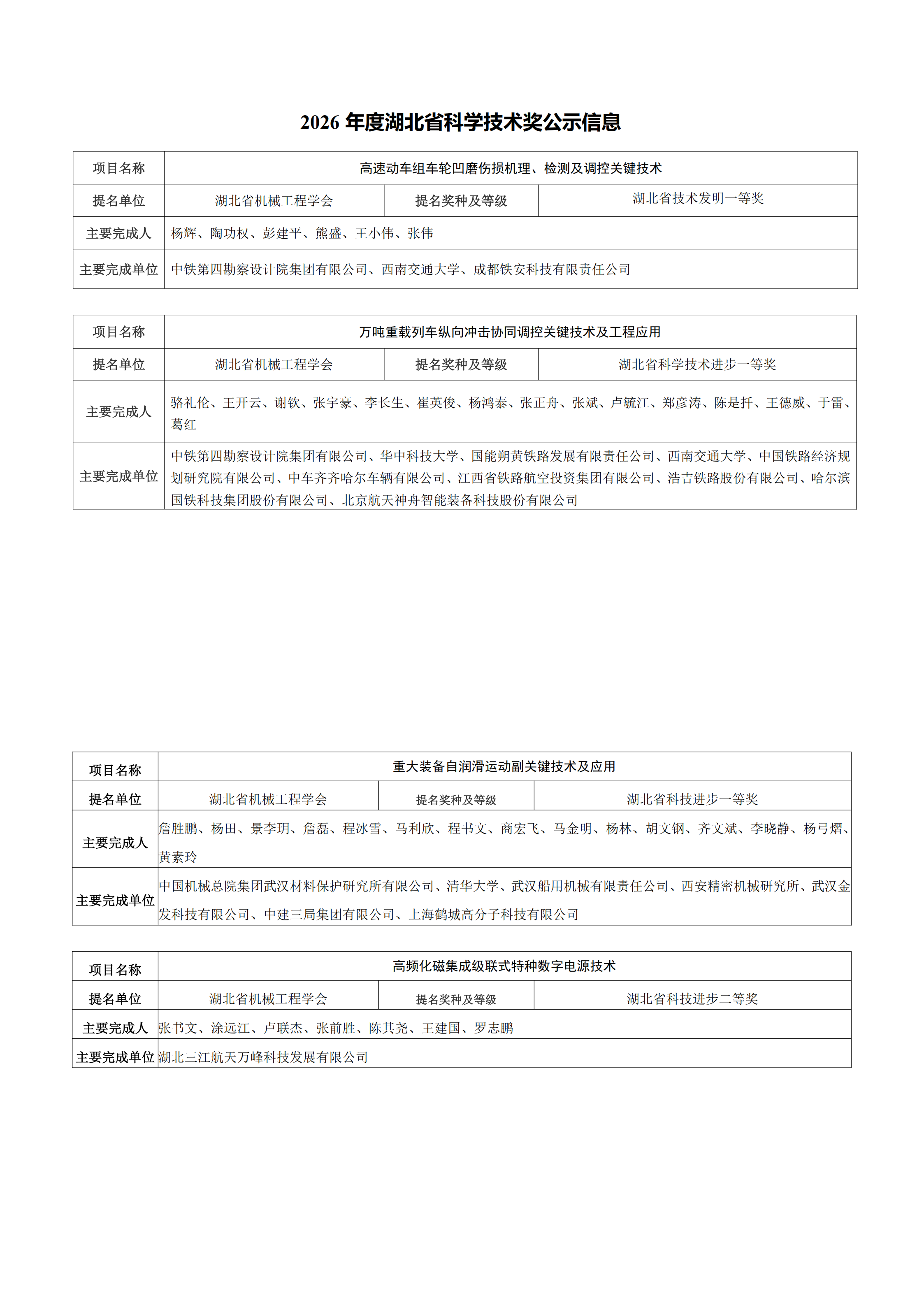 根据湖北省科学技术厅《关于开展2026年度省科学技术奖提名工作的通知》的有关要求,现将我会拟提名的“高速动车组车轮凹磨伤损机理、检测及调控关键技术”等4个项目进行公示。公示期为2026年3月30日-4月3日。